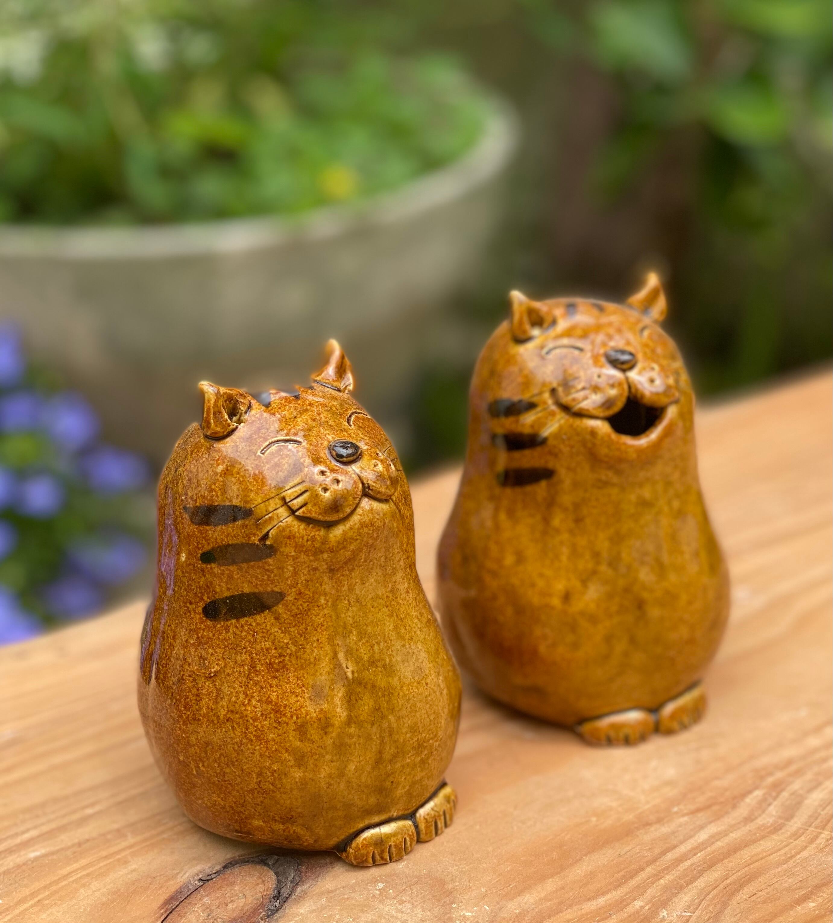 シーサー風に阿吽のお口の猫が、お手手を揃えてちょこんと座っています。
